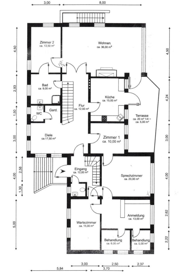 Im zentralen Eingangsbereich befindet sich eine Gäste-Toilette. Über das dortige Treppenhaus gelangt man in die Einliegerwohnung. Diese könnte ebenfalls für weitere Behandlungsräume bzw. als Personalräume dienen.