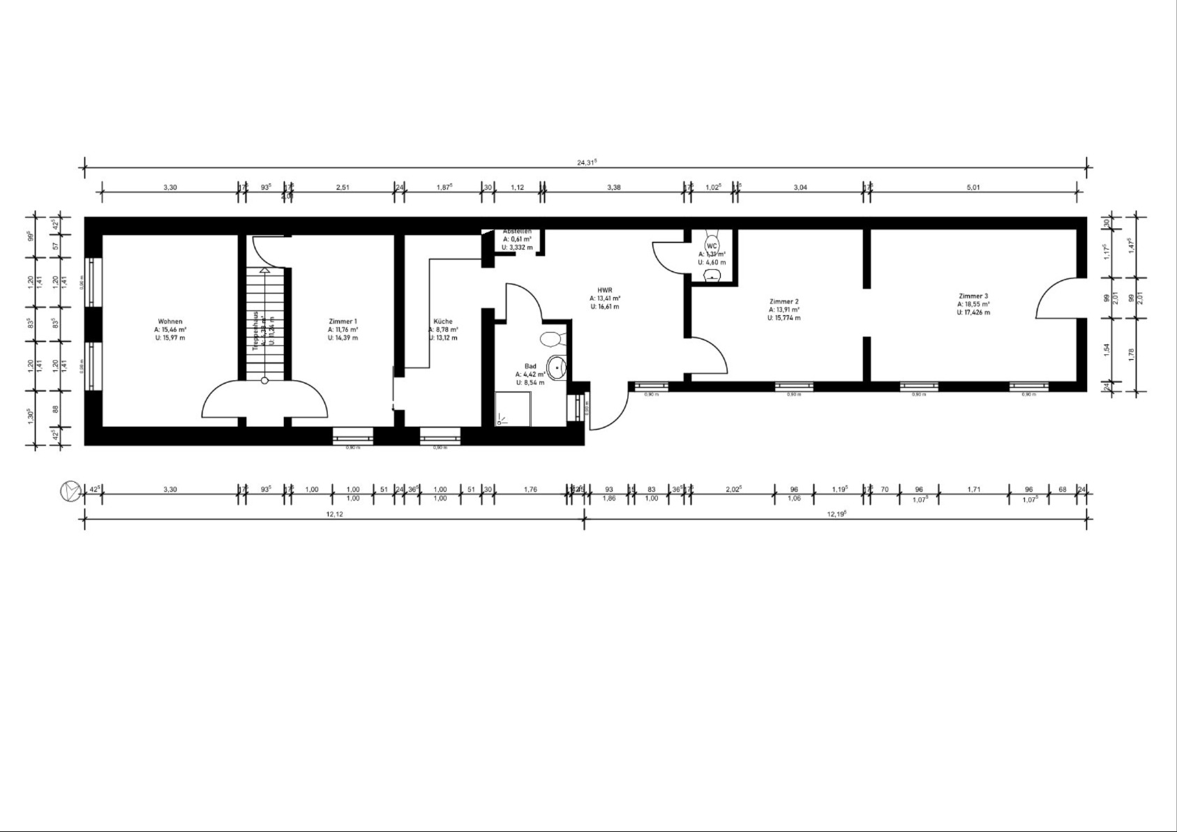 Von der Küche erreicht man über eine kleine Treppe den 1950 angebauten Teil. Man gelangt direkt in einen als Hauswirtschaftsraum genutzten Raum. Von diesem geht das erst neu ausgebaute und barrierearme Bad ab. Ebenfalls erreicht man hier das praktische Gäste-WC. Weiterhin liegt hier der zweite, als Haupteingang genutzte, Eingang. Dieser führt direkt auf den Hof und zur Garage. Einkäufe lassen sich so schnell und ohne großen Aufwand ins Haus schaffen.